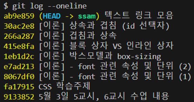- 우선 어느 시점으로 돌아갈 지 보기 위해 git log --oneline을 통해 commit 기록을 봤다