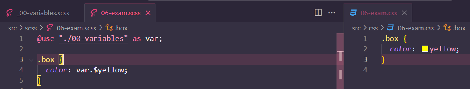 - @import는 사용 중단 예정이라 @use 사용해야 함
