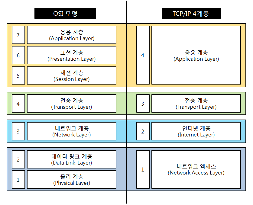 - OSI 7계층은 이론적인 표준안, 현실에 적용하긴 많음 ⇒ 더 효율적인 사용을 위해 TCP/IP 4계층 등장