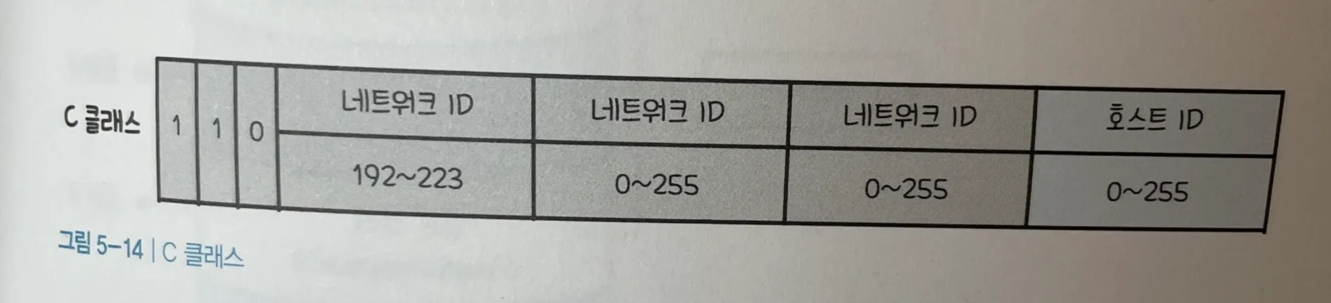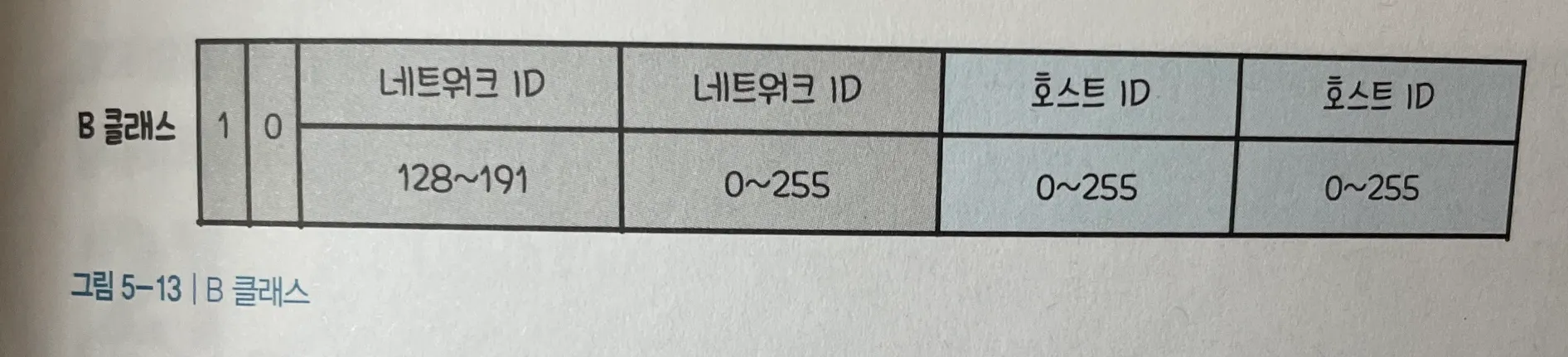 - B 클래스 - 처음 16bit: 네트워크 ID, 나머지 16bit: 호스트 ID